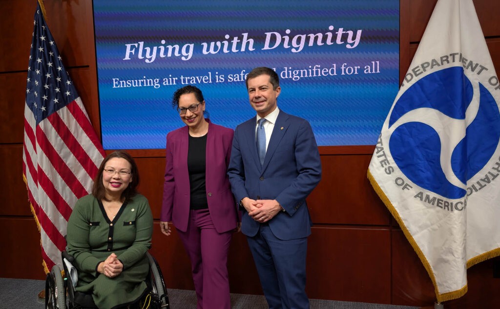 The photo at the top of the page shows U.S. Senator Tammy Duckworth, United Spinal Vice President, Government Relations Alexandra Bennewith and U.S. Transportation Secretary Pete Buttigieg at the event celebrating the rule’s finalization.