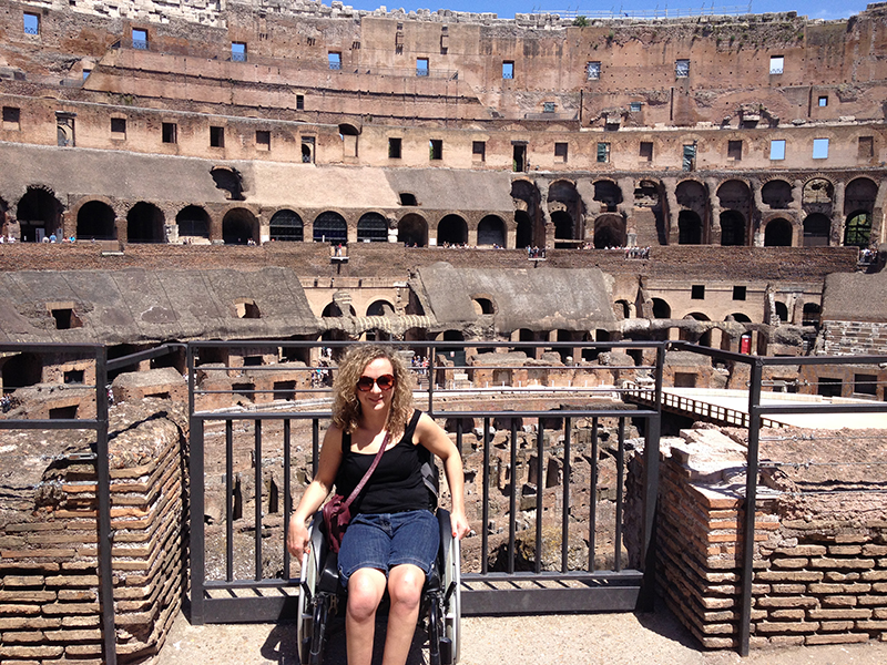 a woman in a manual wheelchair at the colosseum