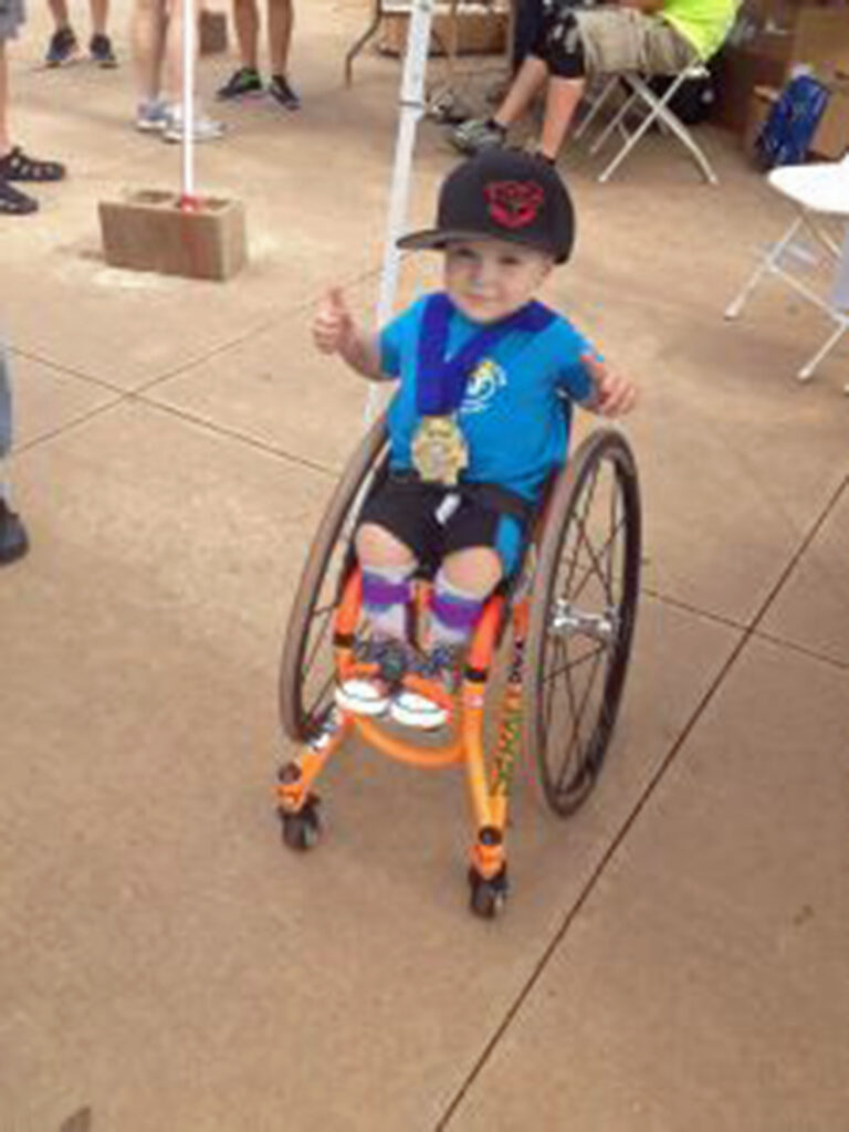 Abel turned 4 on September 17th, 2015. He became the youngest wheelchair athlete at 18 months old. His achievements are in WCMX (adaptive skateboarding), t-ball, tennis, bocci ball, track, surfing, golf, soccer and did his first 1k in 2013. In 2014, he competed at the Endeavor Games in Oklahoma in the 20 meter track and came home with gold, 2nd in his class and first and youngest in gold for his age.