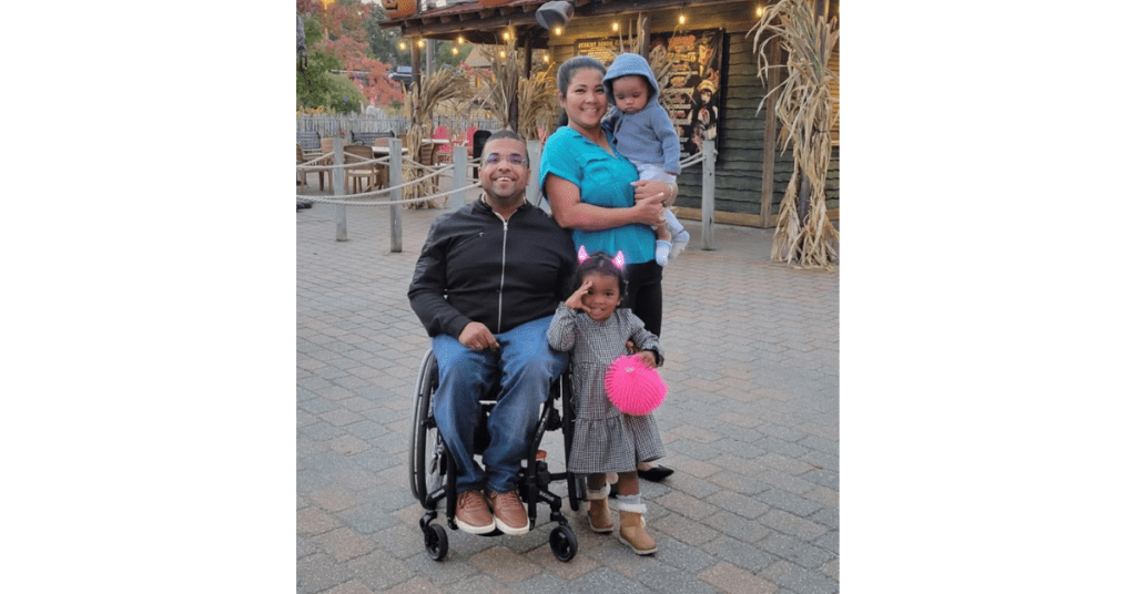 lesly st. louis, a black man and wheelchair user, sits in front of a christmas tree with his family.