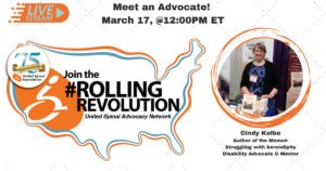 In an Advocacy Network live stream, disability advocate, peer mentor, mother to a daughter with a SCI, and author of the memoir Struggling with Serendipity, Cindy Kolbe, was the featured guest advocate.