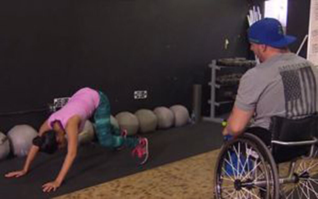 man in manual wheelchair training a woman exercising on the floor