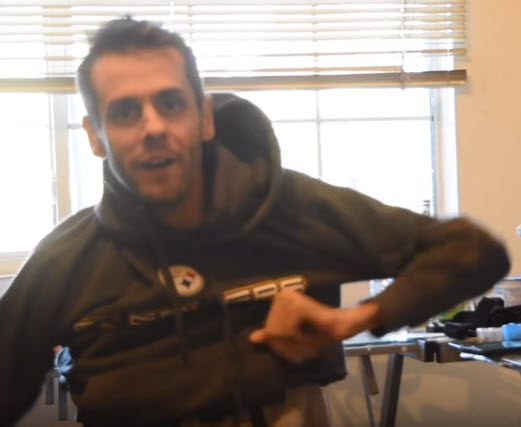 However, Shawn does show that it is possible to put the sweatshirt on if the zipper is not done. Putting his arms through the sleeves, like he did with the basic sweatshirt, he smoothes out the material so it is not bunched up. With his hands under the flat fabric he then raises his arms over his head, carrying the fabric over his head. As Shawn says, “I flip [the sweatshirt] over my head to the back.”