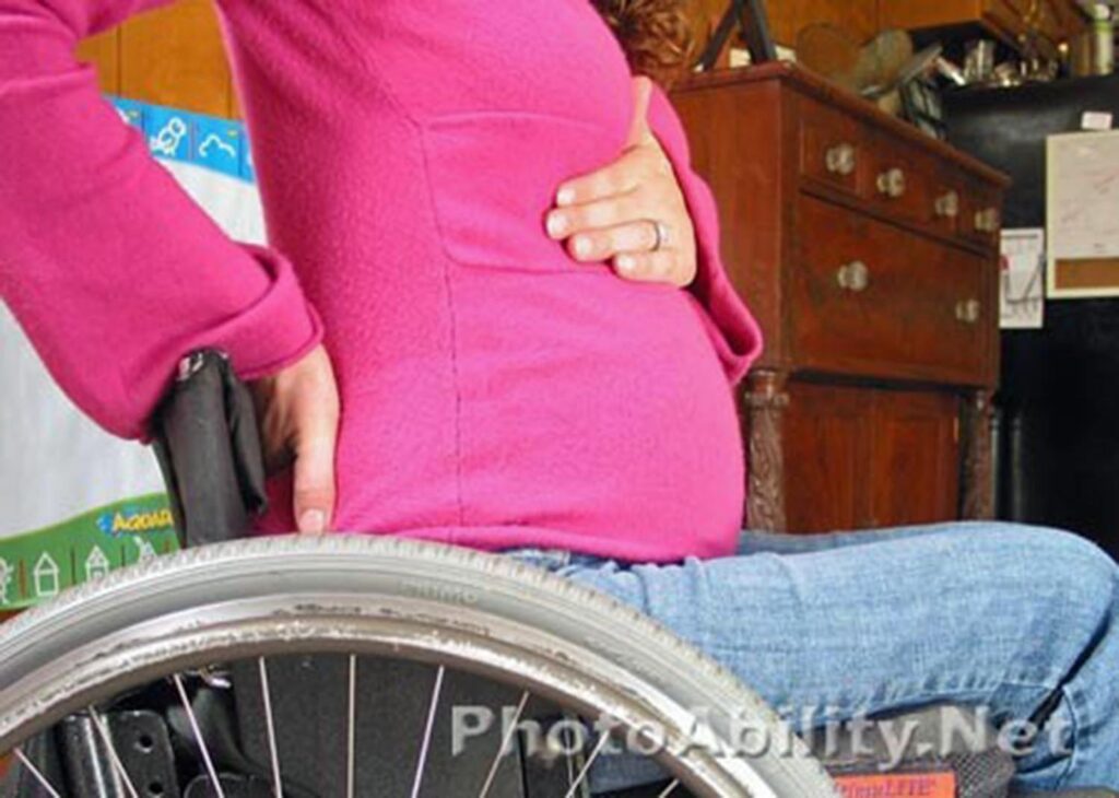 Paralyzed woman in a manual wheelchair with one hand on her lower back and one on her pregnant belly