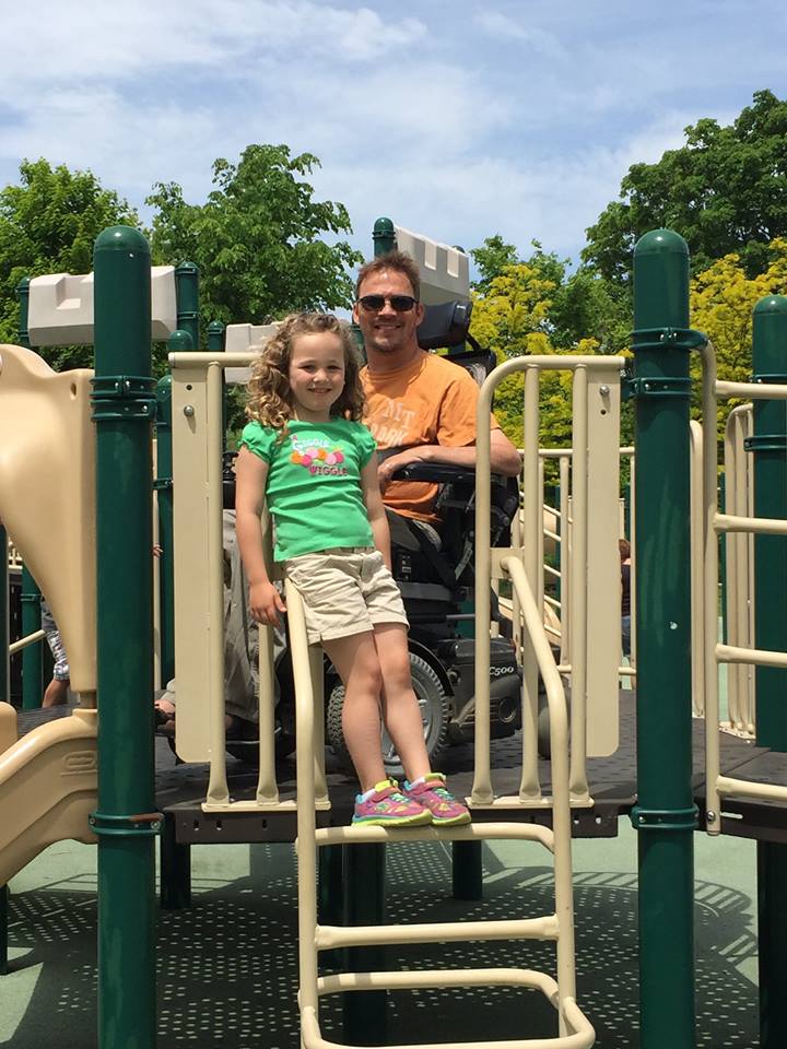 quadriplegic dad and his daughter play on a playground
